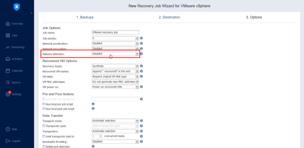 During the New Recovery job Wizard process select malware detection. Default selection is set to Disabled.
