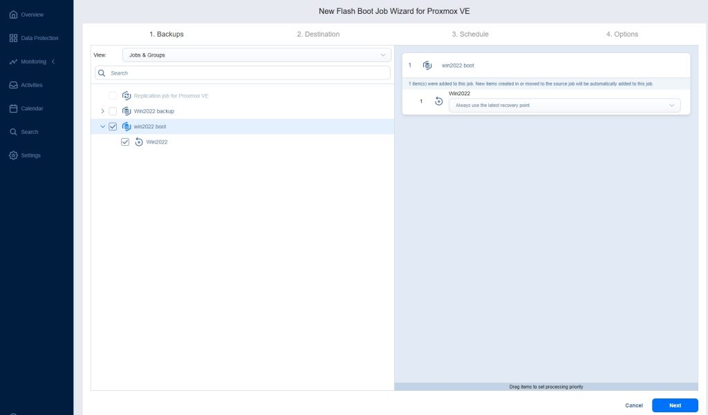 For instance, when you initiate a Flash Boot Recovery for Proxmox VE, the first step is to select the VMs you want to recover on the Backups screen. This determines which backup will be used to instantly boot your virtual machines.