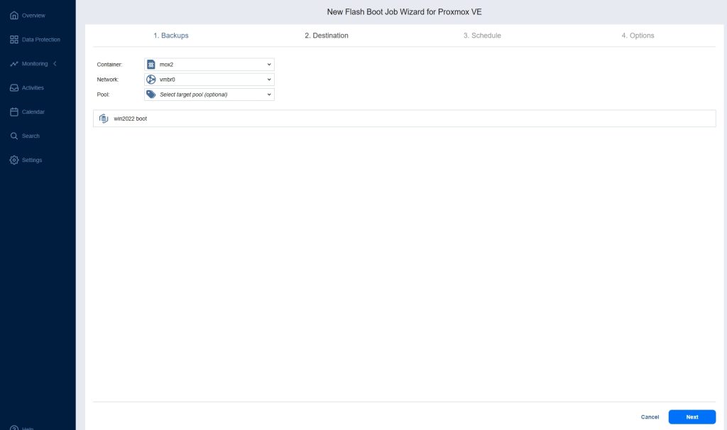 On the Destination screen, choose the container, network, and storage pool where the recovered virtual machine will run. These settings define where and how your VM will be launched during the Flash Boot process.