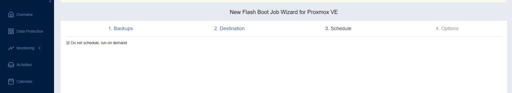 On the Schedule screen, decide whether you want the Flash Boot job to run automatically at a specific time or only when you trigger it manually. To run it manually, simply select Do not schedule (run on demand).