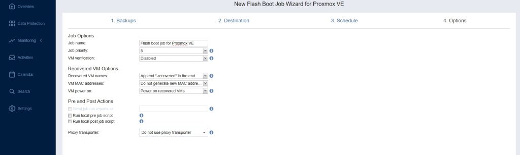 On the Options screen, you can fine-tune the recovery process — give your job a clear name, set its priority level, adjust recovered VM settings, and configure Pre and Post actions to automate tasks before and after the Flash Boot job runs.