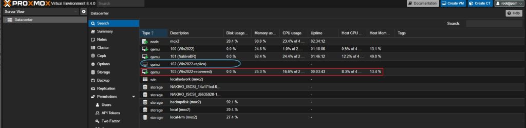After the process completes, you’ll see your recovered VM running directly in the Proxmox VE console. The job completes almost instantly, and the VM is ready to use right away.