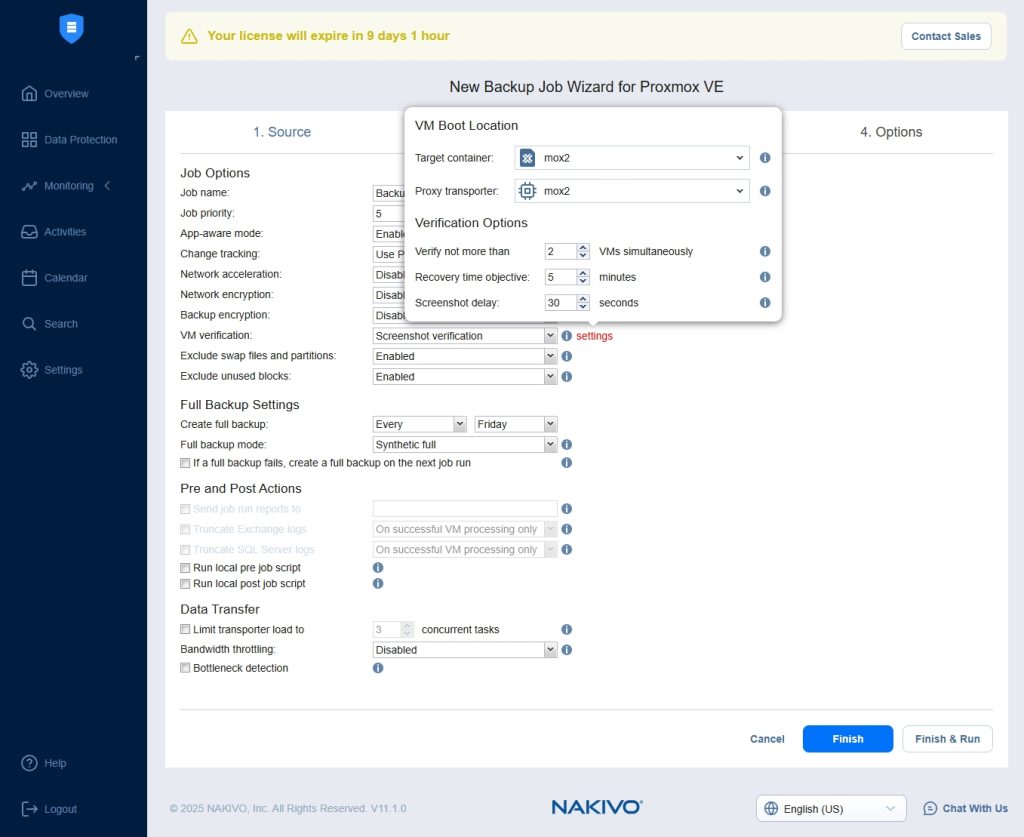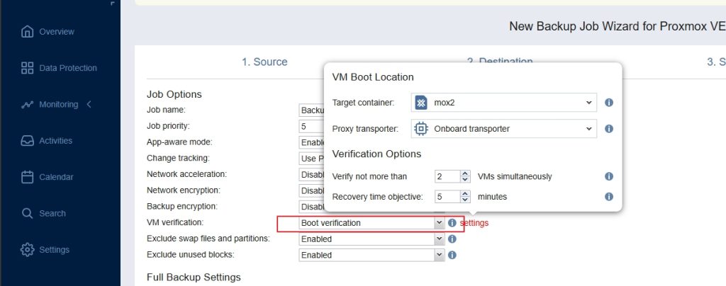 In the options section, select all the options that you require. A great option is VM verification so that you don’t have verify every backup manually. You have two options. A popular method is Screenshot verification.