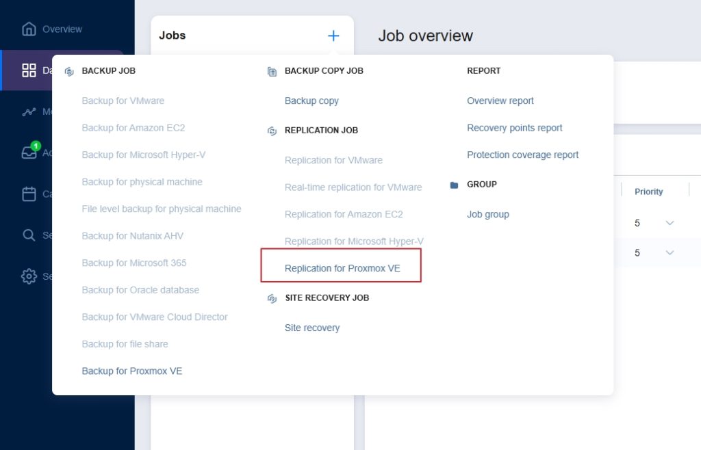To create a replication job, click the plus (+) icon and select Replication for Proxmox VE.