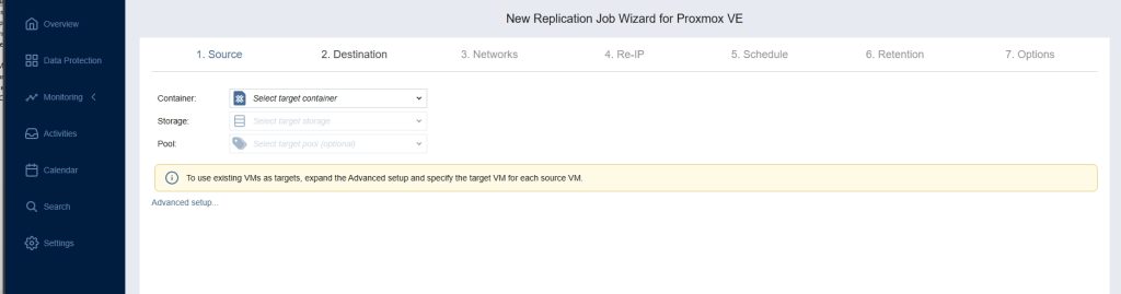 Next, on the Destination screen, review and select all the necessary options for your replication job.