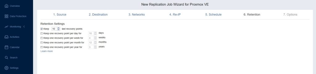 On the Retention screen, define how many recovery points you want to keep and how long they should be retained for your replication job.