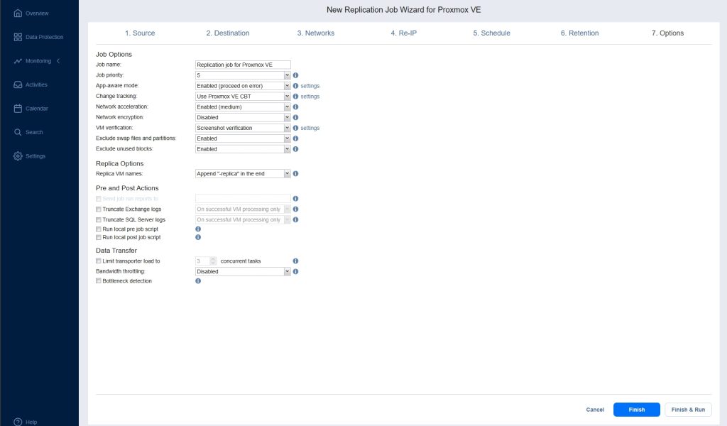On the Options screen, you can fine-tune your replication job settings. Enable App-Aware Mode for application-consistent replicas, choose the change tracking method, and turn on network acceleration to improve performance. You can also configure VM verification, set custom replica VM names, and specify Pre and Post actions to automate tasks before or after replication. Additionally, you can limit the transporter load to optimize resource usage.