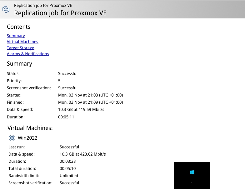 One of Nakivo’s best features is Boot Verification. Trust me — I know how useful this is. At one of my previous companies, I had to manually verify every single backup because there was no automated verification feature available. With Nakivo, that’s no longer an issue. You’ll receive a job report via email, and if you selected the screenshot option on the Options screen, you’ll even see a screenshot of the booted VM as proof that the backup is valid.