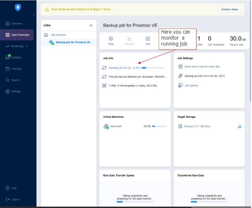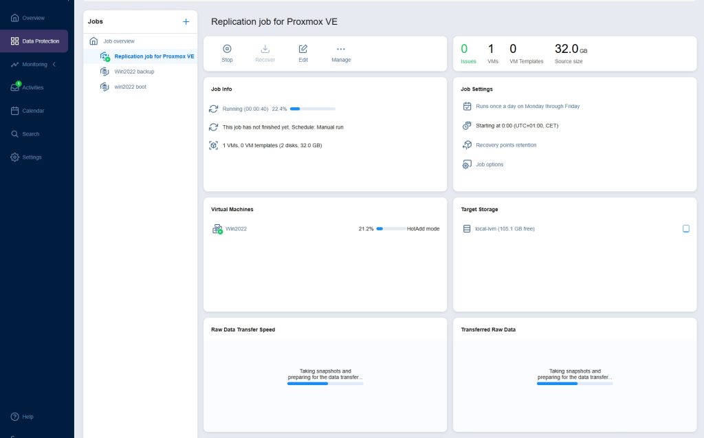 After the replication job starts, you can easily monitor its progress and status from the Data Protection screen, where all active and completed jobs are displayed.