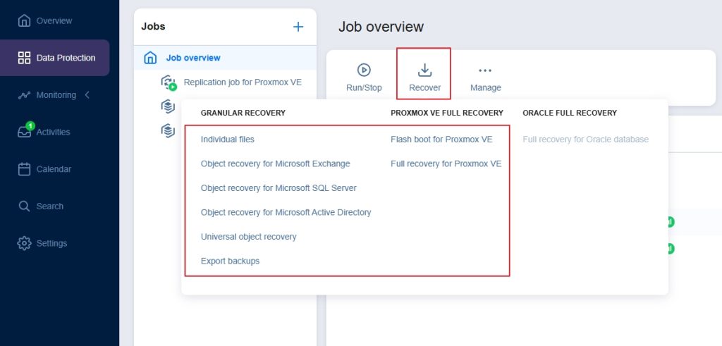 For example, you can not only back up your VMs, but also replicate them with IP remapping, and even boot VMs directly from backup. Additionally, you can recover individual files or perform object-level recovery for Microsoft Exchange, SQL Server, and Active Directory.