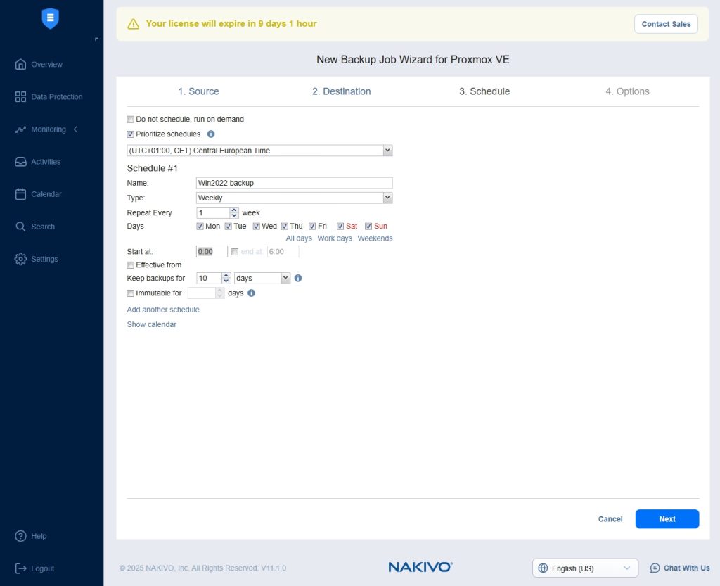 On the Schedule screen, set up how often and when you want your replication job to run — whether it’s daily, weekly, or at custom intervals.