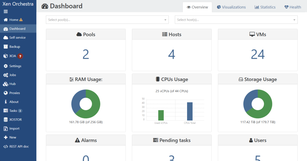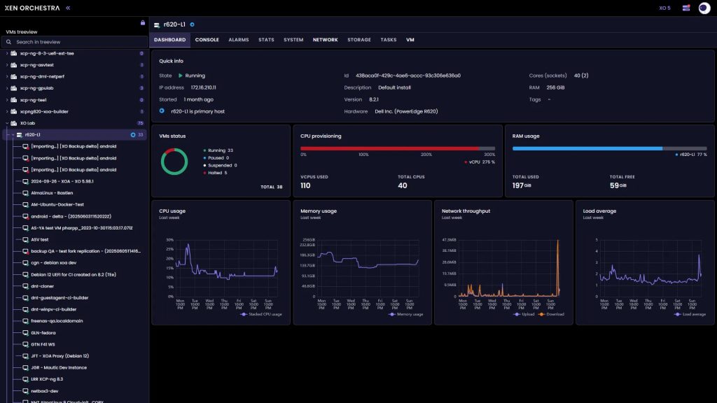 Xen Orchestra delivers a sleek, web-based dashboard with real-time metrics, live migration, backup scheduling, and multi-pool management.